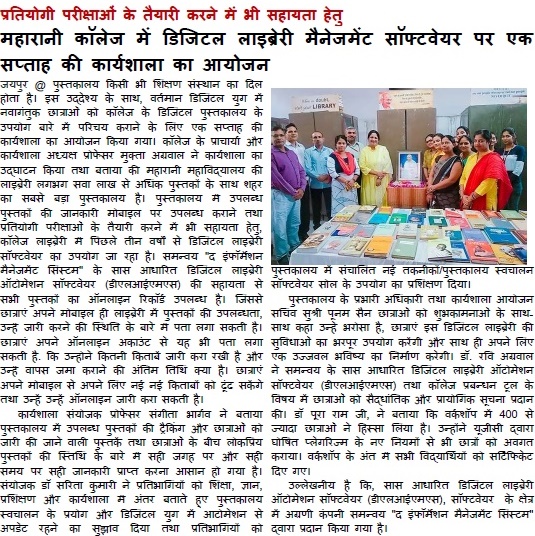 जयपुर @ पुस्तकालय किसी भी शिक्षण संस्थान का दिल होता है। इस उद्देश्य के साथ, वर्तमान डिजिटल युग में नवागंतुक छात्राओं को कॉलेज के डिजिटल पुस्तकालय के उपयोग बारे में परिचय कराने के लिए एक सप्ताह की कार्यशाला का आयोजन किया गया। कॉलेज के प्राचार्या और कार्यशाला अध्यक्ष प्रोफेसर मुक्ता अग्रवाल ने कार्यशाला का उद्घाटन किया तथा बताया की महारानी महाविद्यालय की लाइब्रेरी लगभग सवा लाख से अधिक पुस्तकों के साथ शहर का सबसे बड़ा पुस्तकालय है। पुस्तकालय में उपलब्ध पुस्तकों की जानकारी मोबाइल पर उपलब्ध कराने तथा प्रतियोगी परीक्षाओं के तैयारी करने में भी सहायता हेतु, कॉलेज लाइब्रेरी में पिछले तीन वर्षों से डिजिटल लाइब्रेरी सॉफ्टवेयर का उपयोग जा रहा है। समन्वय "द इंफॉर्मेशन मैनेजमेंट सिस्टम" के सास आधारित डिजिटल लाइब्रेरी ऑटोमेशन सॉफ्टवेयर (डीएलआईएमएस) की सहायता से सभी पुस्तकों का ऑनलाइन रिकॉर्ड उपलब्ध है। जिससे छात्राएं अपने मोबाइल ही लाइब्रेरी में पुस्तकों की उपलब्धता, उन्हें जारी करने की स्थिति के बारे में पता लगा सकती है। छात्राएं अपने ऑनलाइन अकाउंट से यह भी पता लगा सकती है. कि उन्होने कितनी किताबें जारी करा रखी है और उन्हें वापस जमा कराने की अंतिम तिथि क्या है।