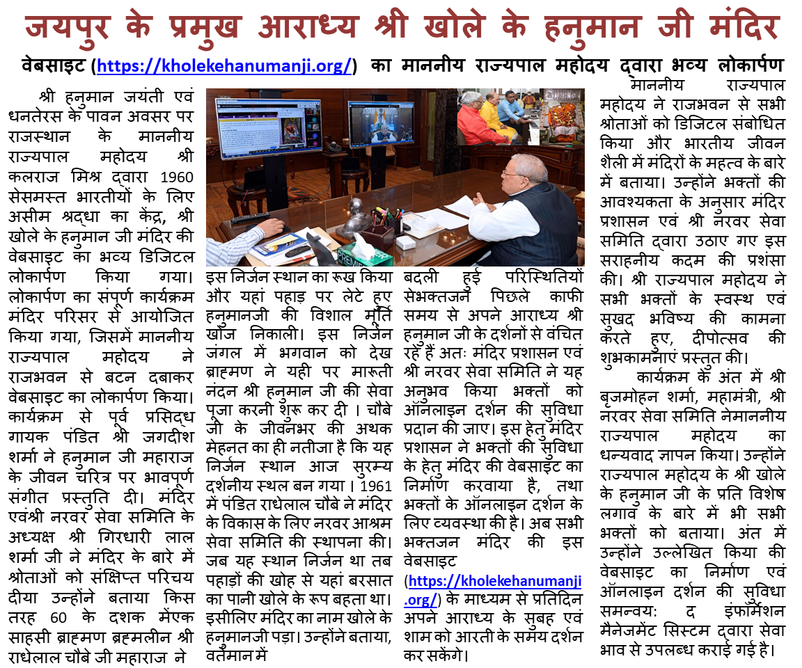 श्री हनुमान जयंती एवं धनतेरस के पावन अवसर पर राजस्थान के माननीय राज्यपाल महोदय श्री कलराज मिश्र द्वारा 1960 सेसमस्त भारतीयों के लिए असीम श्रद्धा का केंद्र, श्री खोले के हनुमान जी मंदिर की वेबसाइट का भव्य डिजिटल लोकार्पण किया गया। लोकार्पण का संपूर्ण कार्यक्रम मंदिर परिसर से आयोजित किया गया, जिसमें माननीय राज्यपाल महोदय ने राजभवन से बटन दबाकर वेबसाइट का लोकार्पण किया। कार्यक्रम से पूर्व प्रसिद्ध गायक पंडित श्री जगदीश शर्मा ने हनुमान जी महाराज के जीवन चरित्र पर भावपूर्ण संगीत प्रस्तुति दी। मंदिर एवंश्री नरवर सेवा समिति के अध्यक्ष श्री गिरधारी लाल शर्मा जी ने मंदिर के बारे में श्रोताओं को संक्षिप्त परिचय दीया उन्होंने बताया किस तरह 60 के दशक मेंएक साहसी ब्राह्मण ब्रह्मलीन श्री राधेलाल चौबे जी महाराज ने इस निर्जन स्थान का रूख किया और यहां पहाड़ पर लेटे हुए हनुमानजी की विशाल मूर्ति खोज निकाली। इस निर्जन जंगल में भगवान को देख ब्राह्मण ने यही पर मारूती नंदन श्री हनुमान जी की सेवा पूजा करनी शुरू कर दी । चौबे जी के जीवनभर की अथक मेहनत का ही नतीजा है कि यह निर्जन स्थान आज सुरम्य दर्शनीय स्थल बन गया । 1961 में पंडित राधेलाल चौबे ने मंदिर के विकास के लिए नरवर आश्रम सेवा समिति की स्थापना की। जब यह स्थान निर्जन था तब पहाड़ों की खोह से यहां बरसात का पानी खोले के रूप बहता था। इसीलिए मंदिर का नाम खोले के हनुमानजी पड़ा। उन्होंने बताया, वर्तमान में बदली हुई परिस्थितियों सेभक्तजन पिछले काफी समय से अपने आराध्य श्री हनुमान जी के दर्शनों से वंचित रहे हैं अतः मंदिर प्रशासन एवं श्री नरवर सेवा समिति ने यह अनुभव किया भक्तों को ऑनलाइन दर्शन की सुविधा प्रदान की जाए। इस हेतु मंदिर प्रशासन ने भक्तों की सुविधा के हेतु मंदिर की वेबसाइट का निर्माण करवाया है, तथा भक्तों के ऑनलाइन दर्शन के लिए व्यवस्था की है। अब सभी भक्तजन मंदिर की इस वेबसाइट (https://kholekehanumanji.org/) के माध्यम से प्रतिदिन अपने आराध्य के सुबह एवं शाम को आरती के समय दर्शन कर सकेंगे।