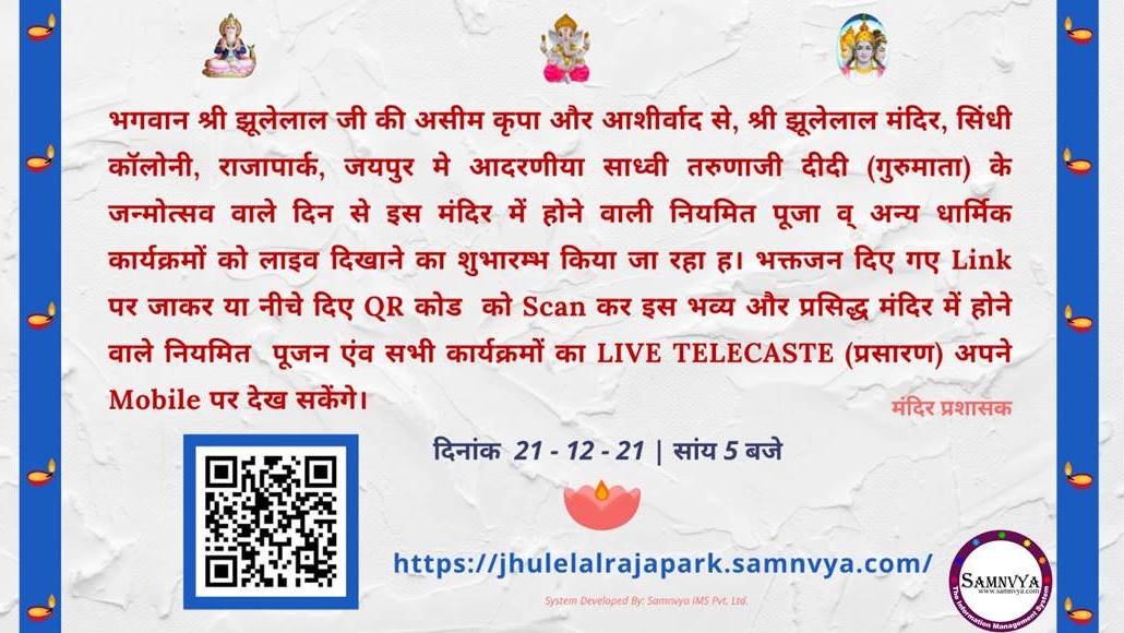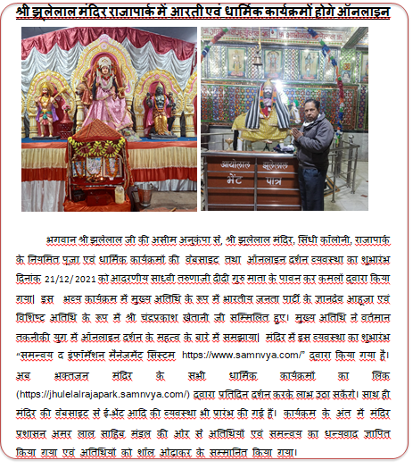 भगवान श्री झूलेलाल जी की असीम अनुकंपा से, श्री झूलेलाल मंदिर, सिंधी कॉलोनी, राजापार्क के नियमित पूजा एवं धार्मिक कार्यक्रमों की वेबसाइट तथा ऑनलाइन दर्शन व्यवस्था का शुभारंभ दिनांक 21/12/ 2021 को आदरणीय साध्वी तरुणाजी दीदी गुरु माता के पावन कर कमलों द्वारा किया गया| इस भव्य कार्यक्रम में मुख्य अतिथि के रूप में भारतीय जनता पार्टी के ज्ञानदेव आहूजा एवं विशिष्ट अतिथि के रूप में श्री चंद्रप्रकाश खेतानी जी सम्मिलित हुए। मुख्य अतिथि ने वर्तमान तकनीकी युग में ऑनलाइन दर्शन के महत्व के बारे में समझाया| मंदिर में इस व्यवस्था का शुभारंभ “समन्वय द इंफॉर्मेशन मैनेजमेंट सिस्टम https://www.samnvya.com/” द्वारा किया गया है। अब भक्तजन मंदिर के सभी धार्मिक कार्यक्रमों का लिंक (https://jhulelalrajapark.samnvya.com/) द्वारा प्रतिदिन दर्शन करके लाभ उठा सकेंगे। साथ ही मंदिर की वेबसाइट से ई-भेंट आदि की व्यवस्था भी प्रारंभ की गई हैं। कार्यक्रम के अंत में मंदिर प्रशासन अमर लाल साहिब मंडल की ओर से अतिथियों एवं समन्वय का धन्यवाद ज्ञापित किया गया एवं अतिथियों को शॉल ओढ़ाकर के सम्मानित किया गया।